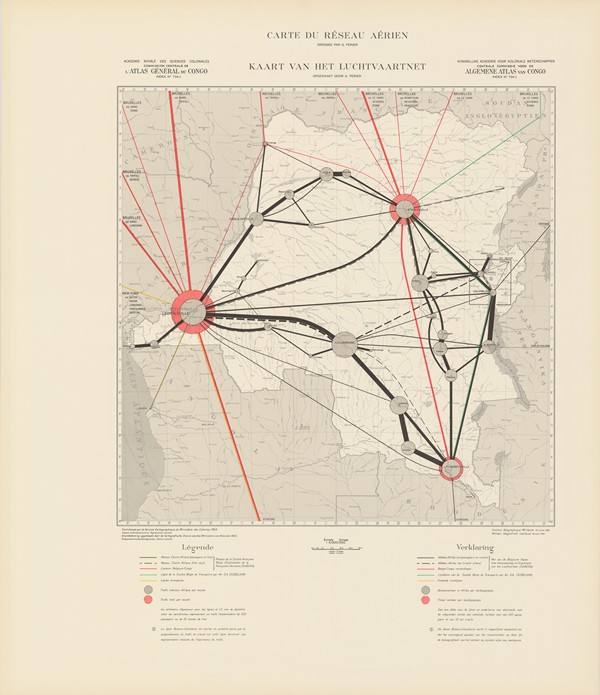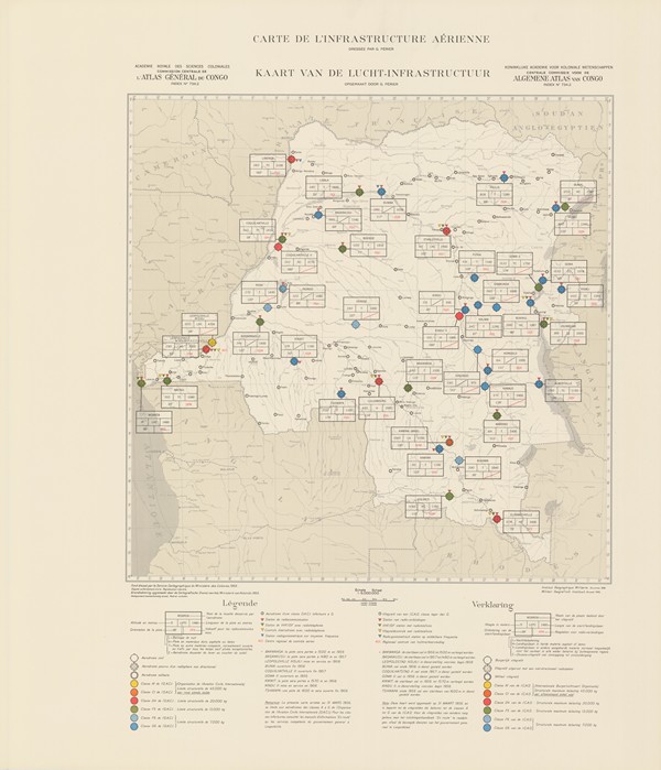 Atlas général du Congo - Algemene atlas van Congo 734.1 Carte de l'aviation / Kaart van het vliegwezen 734.2 Carte de l'infrastructure aérienne / Kaart lucht-infrastructuur PÉRIER, G. - Bruxelles [Belgique] : IRCB / KBKI, 1956. - 3 pp. (73 x 62 cm)