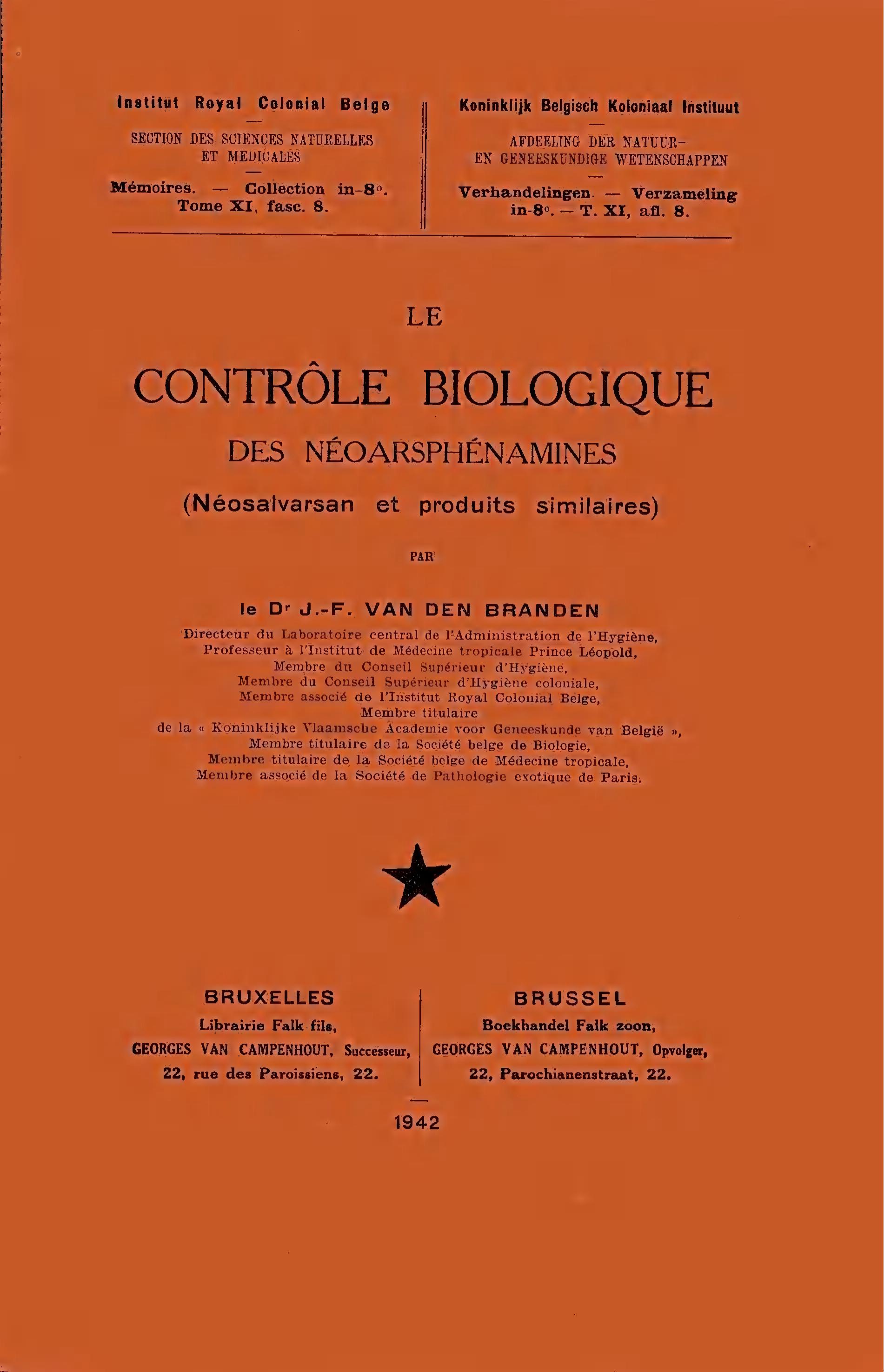 Nat.Sc.(IRCB) VAN DEN BRANDEN, J.F. Le contrôle biologique des Néoarsphénamines (Néosalvarsan et produits similaires). -T.XI,8 (1942)